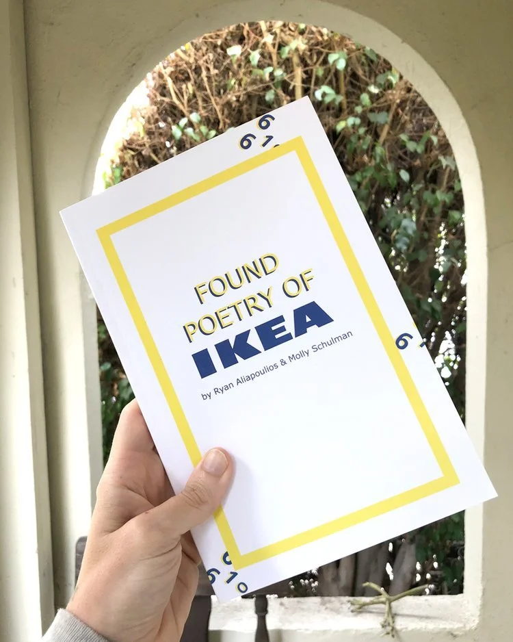 A chapbook combining found visual poems in collaboration with artist Molly Schulman as part of the IKEA Residency. Contains visual/concrete found poems, photos of “uninvited interventions” (art installations staged in IKEA showrooms without permission), and an original IKEA-themed crossword puzzle.